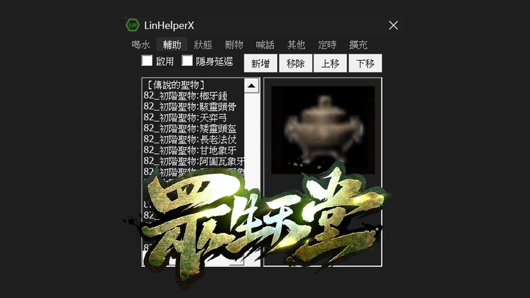把 04/02 新增的 【傳說的聖物】 新增進去 LinHelperX 方便選用 下載後 直接覆蓋 遊戲資料夾內的 LinHelperX.txt 啟動遊戲 點擊 鍵盤 HOME建